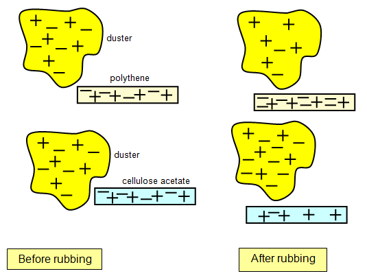 Physics - Unit 2Static electricityFrictionnnn charges which are unable to move build up in one place- causing a static shock or spark. When two insulating layers ( such as a polythene rod and a cloth) rub together, the electrons are transferred from one to the other - changing charges. This means that one will have a positive static charge and one will have a negative static charge. The electrons are passed between each other- because electrons are negatively charged, the material which has less electrons will be positively charged .