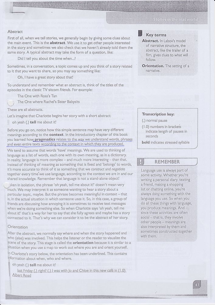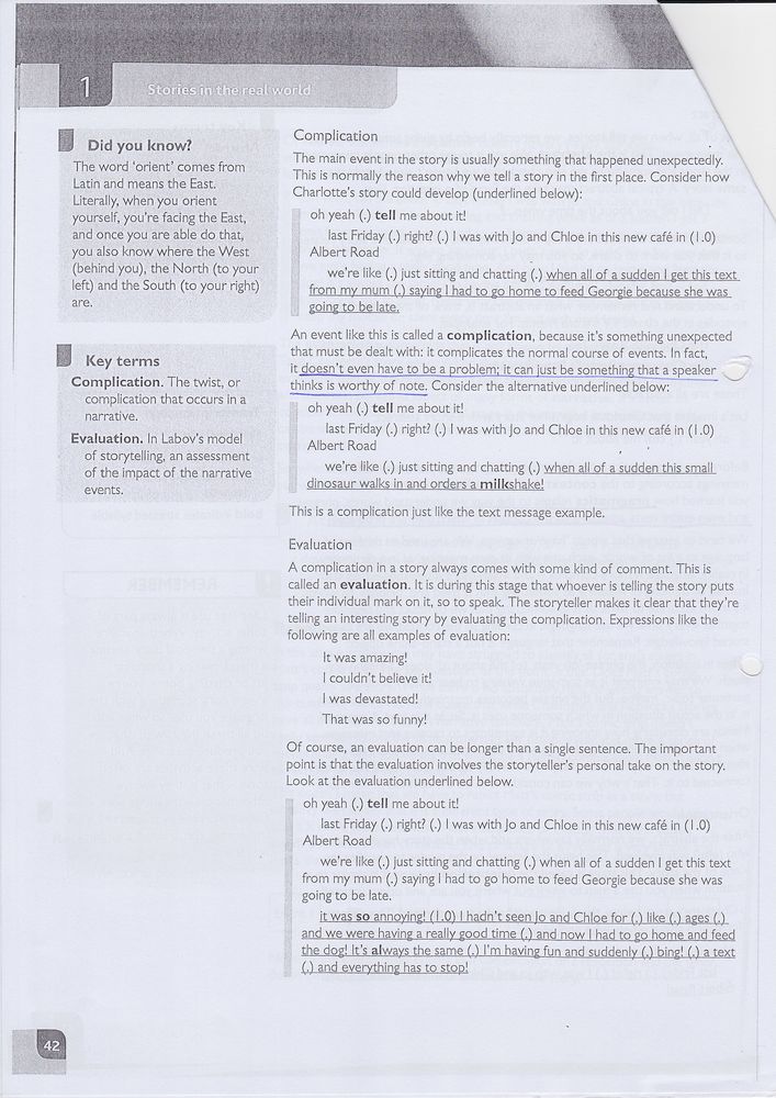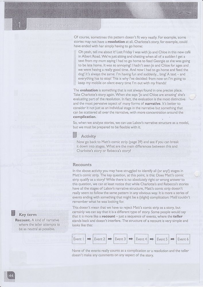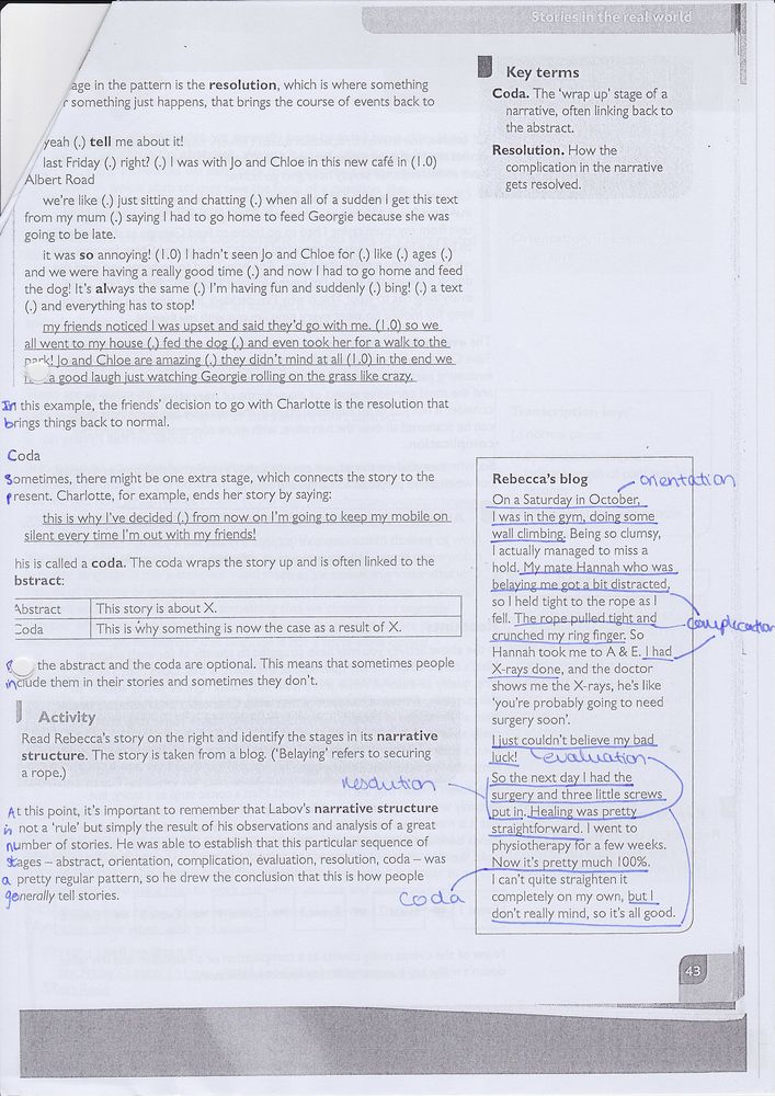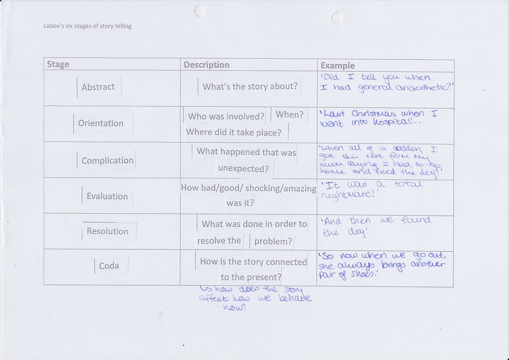 Labov collected a large number of stories from different people during the 1960's, and identified the six different stages of narrtive common to most stories: