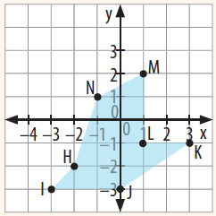 Los vértices del polígono IJKLMN son: I (-3, -3) J ( 0, -3) K ( 3, -1) L ( 1, -1) M(1, 2) N(-1, 1)