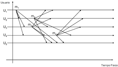 Las peticiones se envían a través de mensajes desde los clientes al servidor y las contestaciones se envían a través de mensajes desde el servidor a los clientes, ambas sincronizadas mediante reloj global común a los clientes y al servidor.