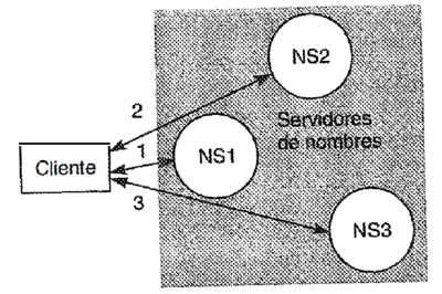 El proceso de localización de los datos con nombre entre más de un servidor de nombres, para resolver un nombre, se llama ...