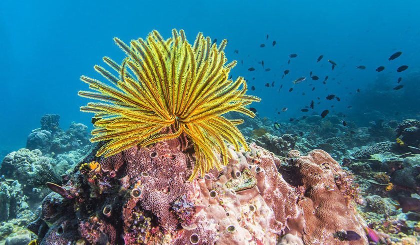 El cuerpo de los crinoideos tiene forma de cáliz, con cinco brazos ramificados y recubiertos de púas.
