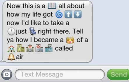 "Now this is a story all about how my life got twister upside down, now I'd like to take a minute just sit right there, tell ya how I became a prince of a town called Bel Air"As you can see from this image, Emojis are used in a very easy way to represent a word without actually using letters. Articles also suggest that Emojis is the only language in the world which everyone from every country can understand without actually having to be taught it. This is because they're the images represent certain things which everyone see as the same. For example '