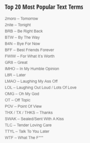 This is the most popular terms of text language. The most common terms is LOL. This as two meanings. usually older people will use LOL as a term for 'lots of love' where as younger adults or teens would use LOL as 'laugh out loud'.As you can see the terms are usually made by the first letter of the word, for example - GR8 the word 'Great' starts with GR and 8 is what finishes the word off. This is understanding as to why teachers are concerned with children having phones too early because it means that children will think that writing in text language is ok when it isn't because its shortening words and not pronouncing words how they're supposed to be.