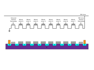 Memoria flash de tipo NORCableado y estructura en silicio de la memoria flash NOR.En las memorias flash de tipo NOR, cuando los electrones se encuentran en FG (Floating Gate), modifican (prácticamente anulan) el campo eléctrico que generaría CG (control Gate) en caso de estar activo. De esta forma, dependiendo de si la celda está a 1 ó a 0, el campo eléctrico de la celda existe o no. Entonces, cuando se lee la celda poniendo un determinado voltaje en CG, la corriente eléctrica fluye o no en función del voltaje almacenado en la celda. La presencia/ausencia de corriente se detecta e interpreta como un 1 ó un 0, reproduciendo así el dato almacenado. En los dispositivos de celda multi-nivel, se detecta la intensidad de la corriente para controlar el número de electrones almacenados en FG e interpretarlos adecuadamente
