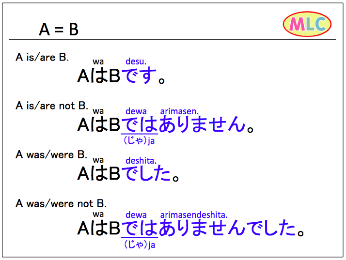 Present positive: AはBです。A wa B desu.Present negative: AはBではありません。A wa B dewa arimasen. (AはBじゃありません。A wa B ja arimasen.= a bit more casual)Past positive: AはBでした。A wa B deshita.Past negative: AはBではありませんでした。A wa B dewa arimasendeshita.(AはBじゃありませんでした。A wa B ja arimasendeshita.= a bit more casual)