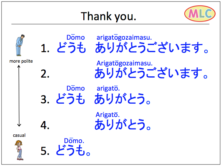 いらっしゃいませ。Irasshaimase. = Welcome. Come in. (May I help you?) おまたせしました。Omatase shimashita. = Sorry I kept you waiting. 1まんえん おあずかりします。Ichi-man-en oazukari shimasu. = I receive/keep 10,000 yen. 5せんえんの おかえしです。Go-sen-yen no okaeshi desu. = (Here is your) change 5,000 yen. ありがとうございました。Arigatougozaimashita. = Thank you. (past) また おこしください。Mata okoshi kudasai. = Please come again.