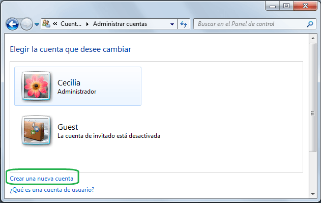 Allí tendremos una nueva pantalla (como la que pueden ver sobre este párrafo), que tiene un cuadro con las cuentas que ya existen, y algunos enlaces debajo del mismo. El primero de estos enlaces es “Crear una nueva cuenta”, y es el que debemos clickear para llegar al último paso.En la siguiente pantalla, podemos darle un nombre a este usuario, y elegir si queremos que también tenga permisos de administrador, o si queremos que sea un usuario “común”.