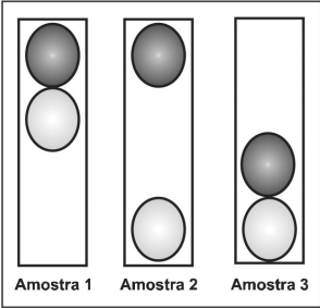 O controle de qualidade é uma exigência da sociedade moderna na qual os bens de consumo são produzidos em escala industrial. Nesse controle de qualidade são determinados parâmetros que permitem checar a qualidade de cada produto. O álcool combustível é um produto de amplo consumo muito adulterado, pois recebe adição de outros materiais para aumentar a margem de lucro de quem o comercializa. De acordo com a Agência Nacional de Petróleo (ANP), o álcool combustível deve ter densidade entre 0,805 g/cm3 e 0,811 g/cm3. Em algumas bombas de combustível a densidade do álcool pode ser verificada por meio de um densímetro similar ao desenhado abaixo, que consiste em duas bolas com valores de densidade diferentes e verifica quando o álcool está fora da faixa permitida. Na imagem, são apresentadas situações distintas para três amostras de álcool combustível. A respeito das amostras ou do densímetro, pode-se afirmar que