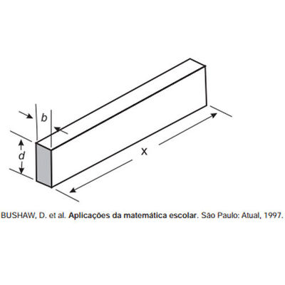 A resistência mecânica \(S\) de uma viga de madeira, em forma de um paralelepípedo retângulo, é diretamente proporcional à sua largura (\(b\)) e ao quadrado de sua altura (\(d\)) e inversamente proporcional ao quadrado da distância entre os suportes da viga, que coincide com o seu comprimento (\(x\)), conforme ilustra a figura. A constante de proporcionalidade \(k\) é chamada de resistência da viga.