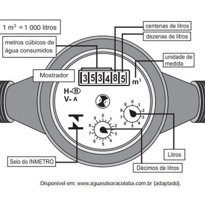 Considerando as informações indicadas na figura, o consumo total de água registrado nesse hidrômetro, em litros, é igual a