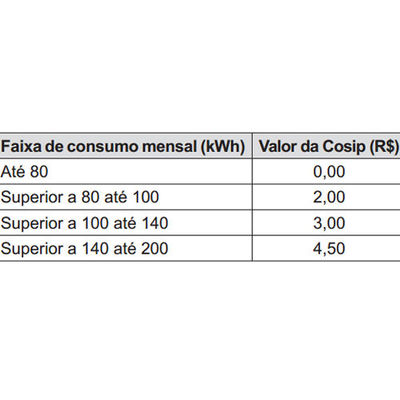 O valor da Cosip é fixo em cada faixa de consumo. O quadro mostra o valor cobrado para algumas faixas.
