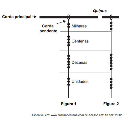 Os incas desenvolveram uma maneira de registrar quantidades e representar números utilizando um sistema de numeração decimal posicional: um conjunto de cordas com nós denominado “quipus”. O “quipus” era feito de uma corda matriz, ou principal (mais grossa que as demais), na qual eram penduradas outras cordas, mais finas, de diferentes tamanhos e cores (cordas pendentes). De acordo com a sua posição, os nós significavam unidades, dezenas, centenas e milhares. Na Figura 1, o “quipus” representa o número decimal \(2\, 453\). Para representar o “zero” em qualquer posição, não se coloca nenhum nó.