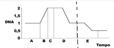 Se considerarmos o gráfico até a linha a tracejado, temos um gráfico da [blank_start]mitose[blank_end]. Se considerarmos o grafico na sua totalidade, o gráfico corresponde a [blank_start]meiose[blank_end]