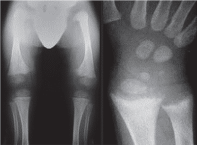 Criança com três anos de idade, nascida a termo, não acompanhada regularmente na Puericultura, foi levada pela mãe para uma consulta na Unidade Básica de Saúde após sofrer fratura no antebraço direito há dois meses. Após avaliação médica foi observado: baixa estatura para a idade, escoliose, desproporção da relação segmento superior e inferior, hipotonia muscular e hérnia umbilical pequena. O médico solicitou radiografia de mão e punho e de membros inferiores, mostradas abaixo.