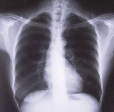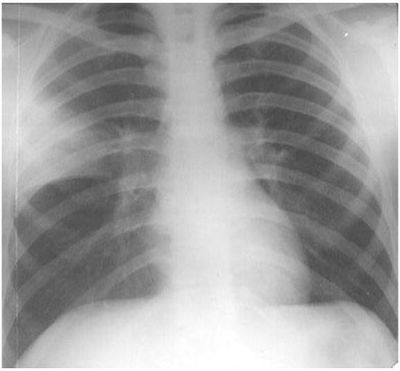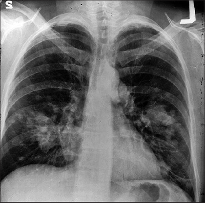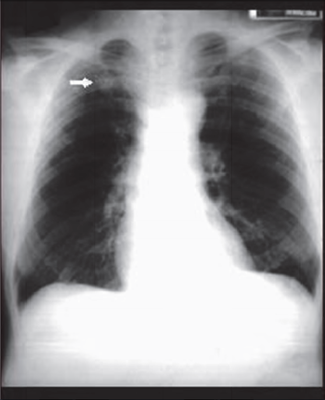 Um paciente do sexo masculino, 55 anos de idade, tabagista 60 maços/ano, com tosse crônica há mais de 10 anos, relata que há cerca de três meses observou a presença de sangue na secreção eliminada com a tosse. Refere ainda perda de cerca de 15% do peso habitual nesse mesmo período, anorexia, adinamia e sudorese noturna. A radiografia de tórax realizada por ocasião da consulta é mostrada abaixo.