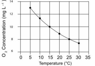 The graph on the left shows the maximum dissolved oxygen concentration in water as a function of temperature at normal atmospheric pressure. What is the volume of O2 that can dissolve n 10.0L of water at \(25\,^{\circ}\)C and normal atmospheric pressure?