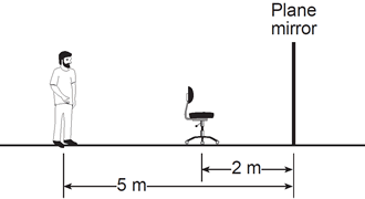 In the diagram below, a person is standing 5 meters from a plane mirror. The chair in front of the person is located 2 meters from the mirror.
