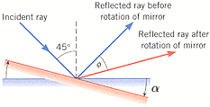 A ray of light strikes a plane mirror at a 45° angle of incidence. The mirror is then rotated by α =31° into the position shown in red in the drawing, while the incident ray is kept fixed. By what angle is the reflected ray rotated?