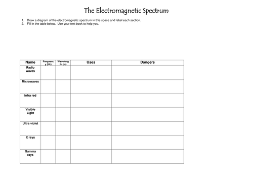 Electromagnetic spectrum dangers and uses. For this question, you can use your book. Please attempt to complete first. Quick tip: Use the symbol > in frequency and wavelengths. EX: 10>2 instead of 10[to the power of] 2.