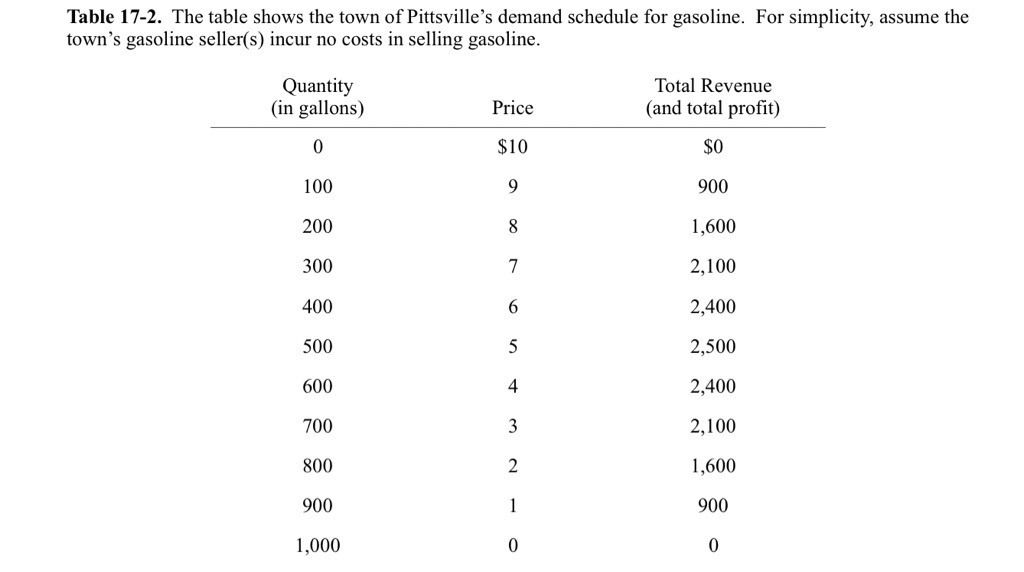 Refer to Table 17-2. If the market for gasoline in Pittsville is a monopoly, then the profit-maximizing monopolist will charge a price of