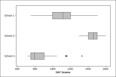 For the SAT college entrance exam (prior to March 2005), the combined scores ranged from 400 to 1600.A study recorded the combined scores from 100 students from each of three schools in a western state.The resulting scores were used to produce these boxplots.