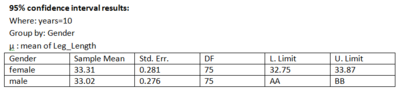 A physiologist was studying the growth of children. As part of this research she was interested in estimating the average length (in centimeters) of the legs of children who were 10 years of age. She took a nationally representative random sample of 10 year old children in the U.S. The resulting data was used to produce the following results.