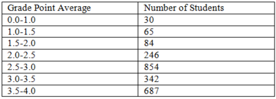 The table above shows the number of students who are within each grade point average range at a university. The amount of students in each grade point average range has been consistent over the past decade. Based on this table, which of the following is the total number of students who received a grade point average from 2.0 to 3.0, inclusive, for the past three years?