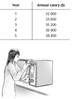 Natasha works for a computer company. The table shows her annual salary in the last five years. If the trend continues, what will Natasha's annual salary be in the 8th year?