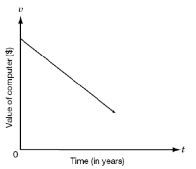 A computer is expected to decrease in value over time. The relationship between the value, v, of the computer in dollars after t years is written as the following equation: