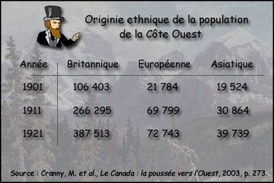 L'image ci-dessus démontre la présence de l'origine ethnique de la population de la Côte Ouest entre les années 1901 et 1921 au Canada dirigé par John A. McDonald.