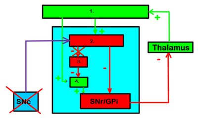 Lack of an inhibitory signal to the GPe means that the GPe sends out excess inhibitory signals to the STN. The STN is therefore inhibited and sends out fewer excitatory signals to the SNr/GPi. This in turn causes fewer inhibitory signals to the thalamus and therefore excitatory signals from the thalamus to the cortex increase.