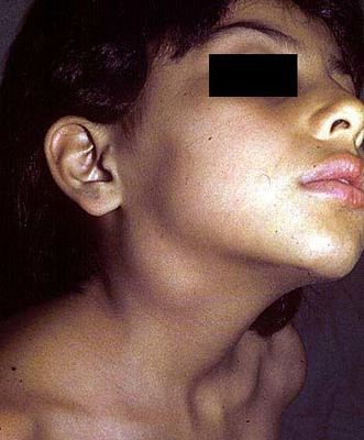 Varón 38 años de edad que va a la consulta por presentar un nódulo en región cervical anterior dependiente de la glándula tiroides. Sus pruebas funcionales eran normales T3,T4 y TSH y la gammagrafía con I131 mostro un nódulo frio y se realizó una biopsia con aguja fina PAAF ¿Cuál de las siguientes características de la exploración física es el indicador más fiable de malignidad?: