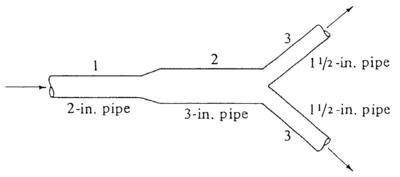 A petroleum crude oil having a density of 892 kg/cu. m is flowing through the piping arrangement shown in the figure at a total rate of 1.388E-3 cu. m/s entering pipe 1. The flow divides equally in each of pipes 3. The steel pipes are schedule 40 pipes. Calculate the total mass flow rate in pipe 1 and pipes 3.