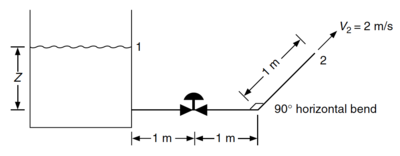 In the vessel shown in the figure, it is required to produce a discharge velocity of 2 m/s. The fluid is water at 20°C with ρ = 1,000 kg/m3 and μ = 0.001 Pa ⋅ s, and the butterfly valve is at θ = 10°. The pipe is 2-in Schedule 40, with an inner diameter of 0.0525 m. The pipe roughness is 0.046 mm. What is the liquid level in the vessel?