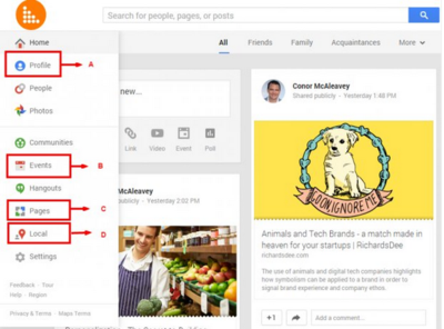Where will you next click in the screen shown in order to create a special branded area for your company within Google+ ? Choose the correct area (A, B, C, or D) below: