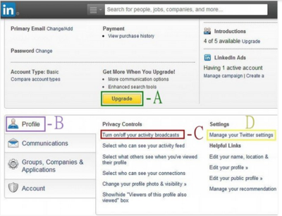 Where would you first click in the screen shown to also add your micro-blogging feeds to your LinkedIn profile? Choose the correct area below (A, B, C, or D):