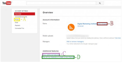 You have just setup a YouTube Channel for your new business. Where would you first click in the screen shown in order to enable monetization for your new YouTube Channel. Chose the correct area (A, B, C, or D) below