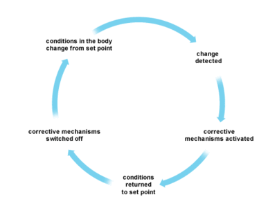 An important part of the [blank_start]homeostatic[blank_end] control system is the [blank_start]reversal[blank_end] of changes that have put the body system off balance. This reversal helps the body back to the [blank_start]steady[blank_end] state it should be in. It is called [blank_start]negative[blank_end] feedback.