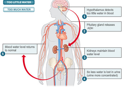 The body's response to temperature changes is a good example of negative feedback. If the body temperature rises above 37 degrees celsius, the [blank_start]receptors[blank_end] detect this and send a message to the processing centre in the brain. The processing centre then directs the [blank_start]effectors[blank_end], in this case the blood vessels, to [blank_start]vasodilate[blank_end] so that heat can be lost through the skin and the body temperature drops. Once the temperature has dropped back to normal, the receptor would detect this and pass the message to the [blank_start]processing[blank_end] centre, which would direct the effectors to return to their normal [blank_start]diameter[blank_end].