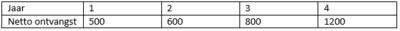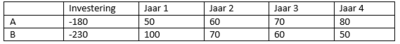 Gegeven zijn de netto-ontvangsten van projecten A en B (x€1.000)