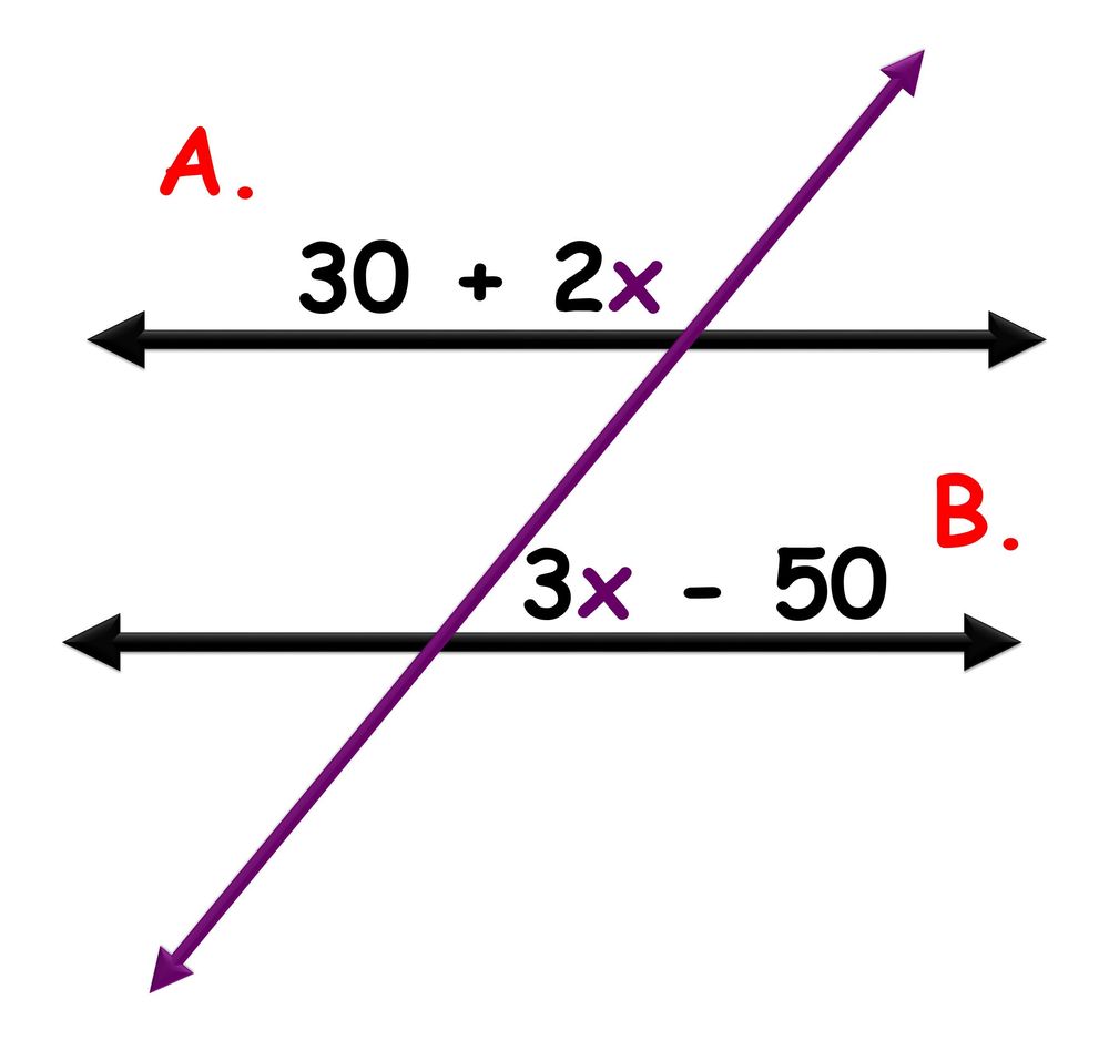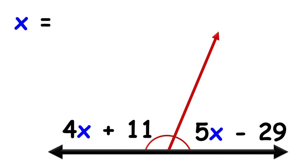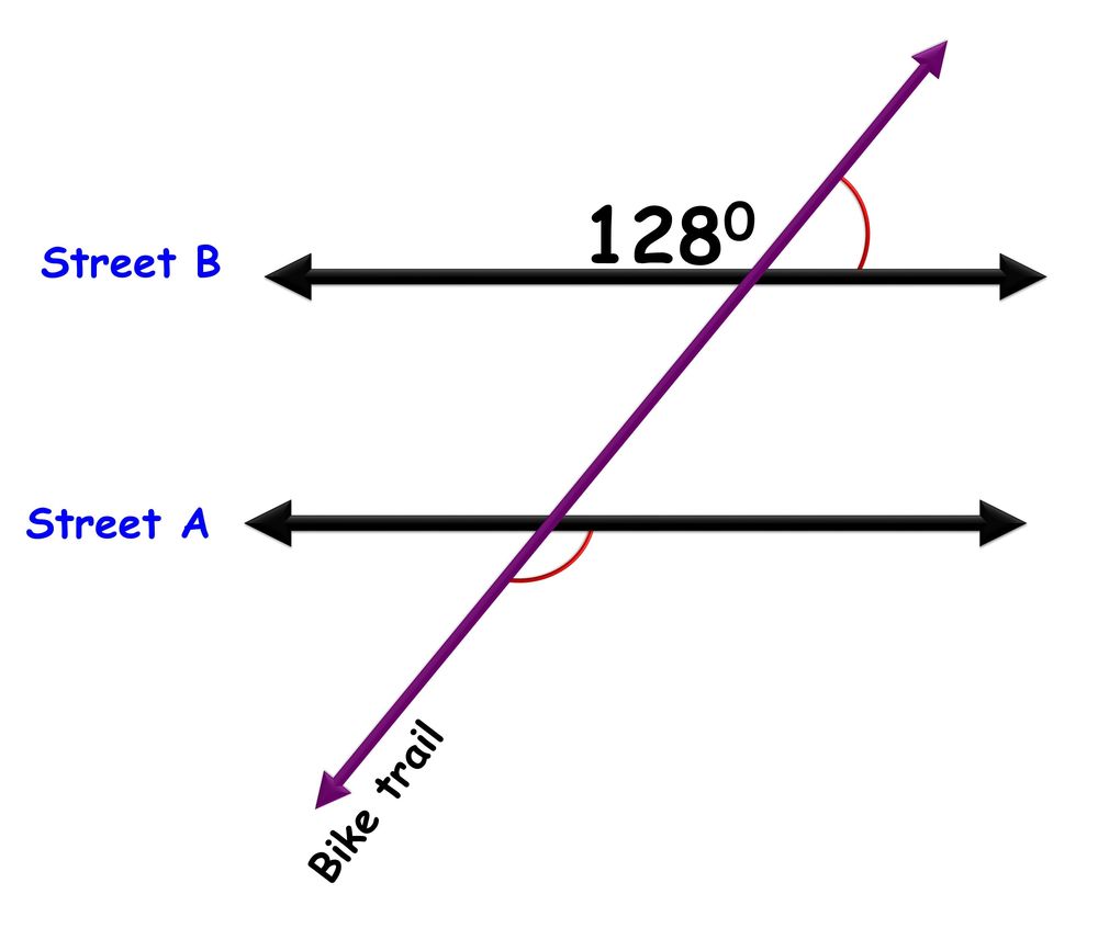 A biker decides to take a short cut across two streets to get home. Below shows the angles he has created with his trail. Fill in the missing angel measurements.