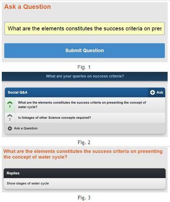 Teacher first shared with students that they have to create an animation to show the concept of water cycle during the lesson. She further communicated the criteria for success for the presentation of the concept. She then used an ICT tool (Social Q&A) to get students to key in their queries on criteria for success. (As shown in Fig 1). Students viewed the questions asked and voted those questions they wanted to address. The most popular questions would automatically rise to the top (As shown in Fig 2), which allowed teachers to know what the most pressing issues were on the success criteria. Students proceeded to answer those questions among themselves. (As Shown in Fig. 3) Followed that, the teacher facilitating a discussion for students to clarify further those queries, especially the few at the top, to achieve a common understanding of criteria for success among the students.