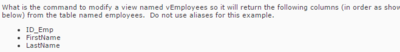 [blank_start]ALTER[blank_end] [blank_start]VIEW[blank_end] [blank_start]vEmployees[blank_end] [blank_start]AS[blank_end] [blank_start]Select[blank_end] [blank_start]ID_EMP[blank_end], [blank_start]FirstName[blank_end], [blank_start]LastName[blank_end] [blank_start]FROM[blank_end] [blank_start]Employees[blank_end]
