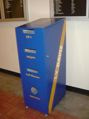 Which waste bin (on campus) do old batteries, small electronics, and CDs go into?