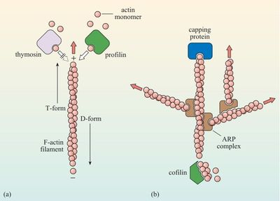 [blank_start]Thymosin[blank_end] inhibits this by [blank_start]sequestering actin[blank_end]. [blank_start]Profilin[blank_end] promotes it by adding actin to the forming branches. The balance between them determines [blank_start]rate of formation[blank_end].