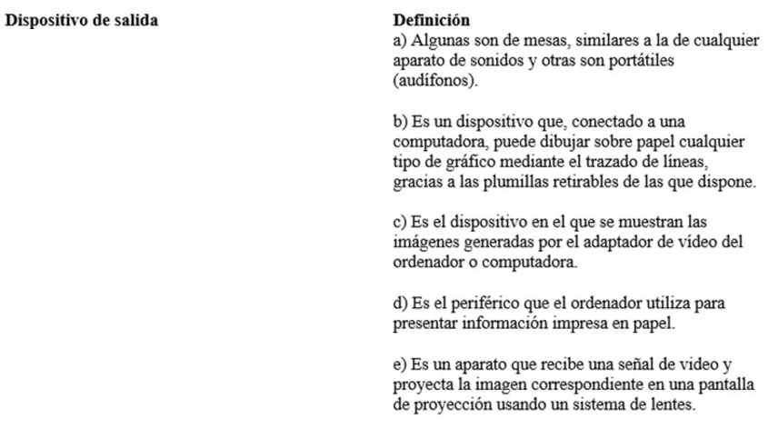 Relaciona las dos columnas que corresponden a los dispositivos de salida más comunes que se pueden utilizar en una organización, con su definición