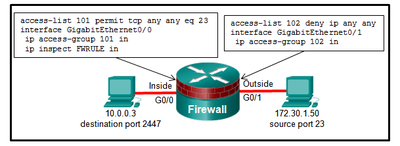 Refer to the exhibit. If a hacker on the outside network sends an IP packet with source address 172.30.1.50, destination address 10.0.0.3, source port 23, and destination port 2447, what does the Cisco IOS firewall do with the packet?