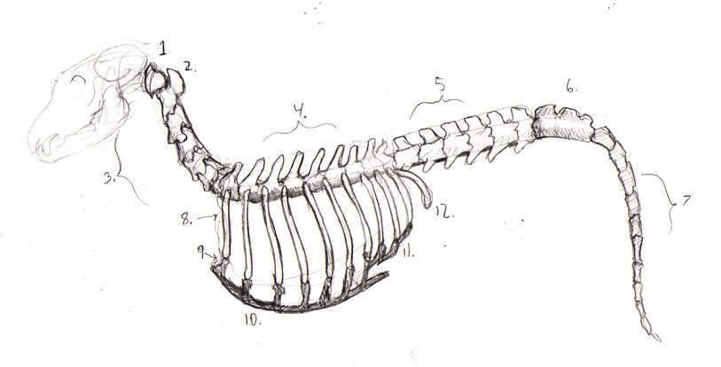 Label the parts of the skeleton. Make sure to add 'vertebrae' after each section of the spine.