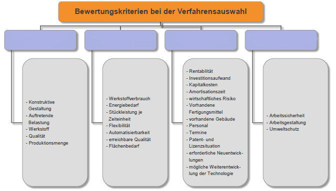 Geben Sie die Bewertungskriterien bei der Auswahl eines Fertigungsverfahrens an.